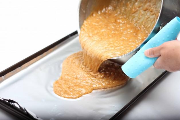 - Whilst still boiling pour the mixture onto a baking tray covered with foil.