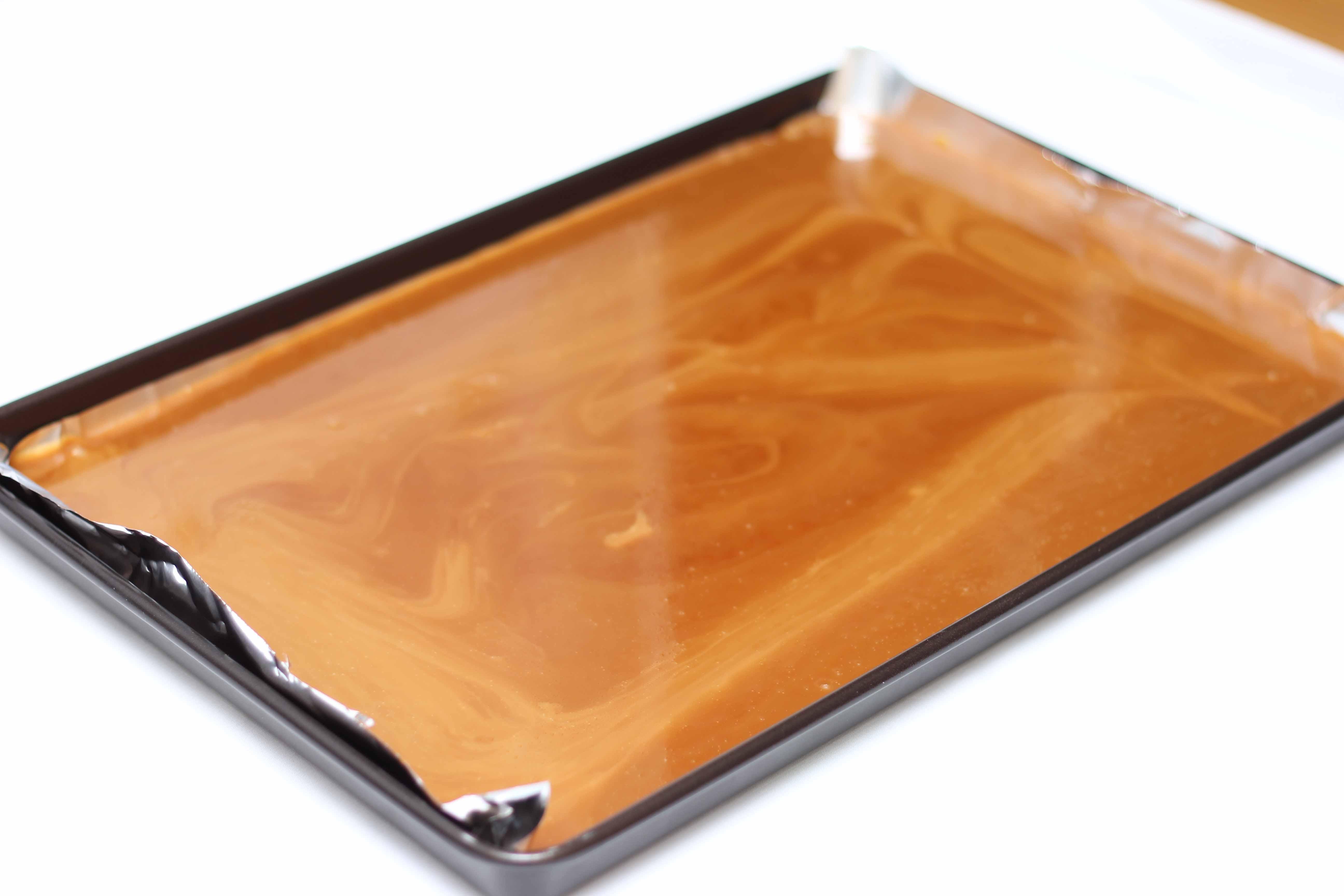 - Spread the toffee around the baking tray to an even level.